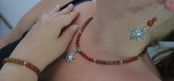 - Collier sur fil en acier, longueur environ 42 cm, fermoir en T & billes en acier inoxydable, bélière & soleil en argent antique. 30 pierres de cornaline en 6 mm & 28 rudrakshas en 6 mm