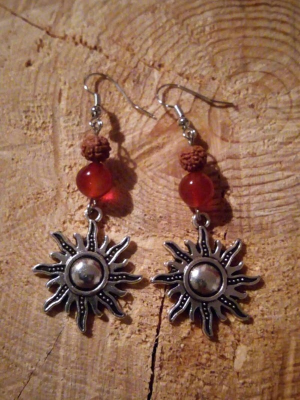 - Boucles d'oreilles de 7 cm environ avec crochets en acier inoxydable, 2 pierres de cornaline en 8 mm, 2 rudrakshas en 6 mm & 2 soleils en argent antique