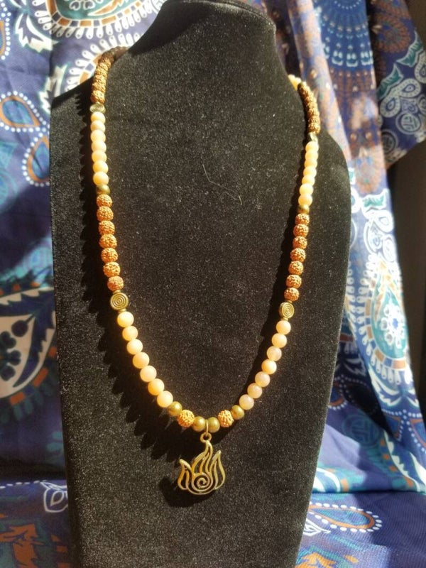 - Le collier est composé de perles en 6 mm : 42 en pierre de soleil & 30 rudrakshas, d'un pendentif feu, de billes, de séparateurs & d'un fermoir en bronze. Monté sur fil acier solide il mesure environ 32 cm de la base du cou au bout du pendentif.