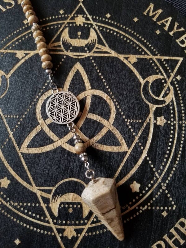 Ce pendule fleur de vie en jaspe paysage est vendu avec une chaine en acier inoxydable pour une double utilisation.