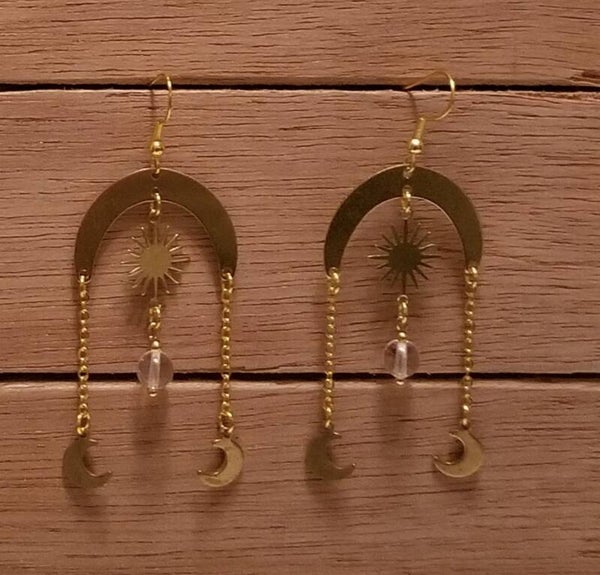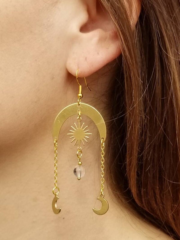 Boucles d'oreilles lunes & soleil en laiton avec perles 6 mm en cristal de roche, légères et agréables à porter. Longueur 8 cm environ