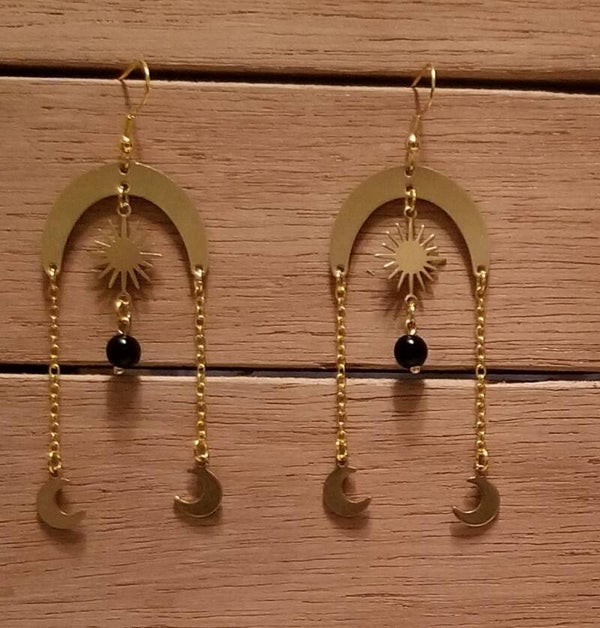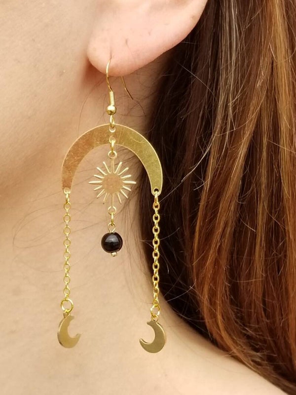 Boucles d'oreilles lunes & soleil en laiton avec perles 6 mm en agate noire, légères et agréables à porter. Longueur 8 cm environ